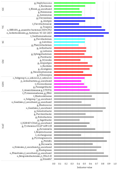 Soil bacterial taxa selected by indicator species analysis for different treatments (restored, control, and natural reference soils). GC: greenhouse crop residues compost; VC: vermicompost; SC: organic compost derived from the mixture of chicken and sheep manure; CM: manure from chickens raised on the soil of organic farms; CON: unamended control soils; NAT: natural reference soil.