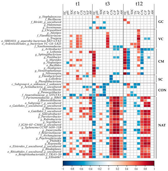Different correlation patterns were found among the 53 selected as treatment indicator physico-chemical properties (EC, pH, TOC, TN, AP, AW) and stoichiometric nutrient ratios (C:N, C:P, N:P) in the different sampling campaigns (t1, t3, and t12) (Figure 4). Overall, the highest number of significant correlations (p < 0.05) was found at time t3, followed by t12, while it was lower at t1. The bacterial taxa of the amended soils clearly differed from those belonging to the natural reference soils (NAT) in terms of their relationship with the soil properties studied (Figure 4). Specifically, in CM-treated soils, the bacterial groups identified with the highest significant positive correlations were related to EC for sampling times t3 and t12 (Figure 4). Alcaligenes, Atopostipes, and Sphingobacterium showed high significant positive correlations with EC. Other bacteria indicative of CM treatment in addition to EC also showed correlations with AP, especially at t12, such as Arthrobacter, Nitrosospira, Pontibacter, Leifsonia, and Myroides, the last two being also correlated with TOC at t1 (Figure 4). Similarly, in VC-treated soils, bacteria such as Truepera, Alistipes, o_SBR1031_g_anaerobic bacterium MO-CFX2, o_Ardenticatenales_bacterium YC-LK-LKJ3, and genera belonging to the Xanthomonadaceae and Flavobacteriaceae families had an intense positive significant correlation with AP during the whole study period. In addition, the last four also correlated with TOC at t1. Regarding CG and SC treatments, the trends were clear regarding the high number of negative correlations with stoichiometric ratios, coinciding in this aspect as VC and CM; however, GC showed that some bacterial taxa such as Staphylococcus had significant positive correlations with pH in t3. Other taxa, such as UTCFX1 and c_Subgroup 6_o_unknown_f_unknown, followed the same trend for pH in CON soils (Figure 4). On the other hand, the bacterial taxa belonging to the NAT soils had an opposite affinity with the soil properties. The NAT soil indicator bacteria showing the highest significant correlations with the stoichiometric ratios C: N, C:P, and N:P (Figure 4), and which were also negatively correlated with EC and AP, included the genera Blastococcus, RB41, Segetibacter, Tychonema CCAP 1459-11B, Psychroglaciecola, PMMR1, Reyranella, Rhodoplanes, Zavarzinella, and Ellin6067 (Figure 4).
