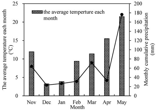 The experiments were conducted during November 2020 and June 2021 and settled in Garden Village, Xinji Town, Yizheng City (32°23′ N, 119°25′ E), with the rice as the previous crop and all the straw returned to the field after harvesting. The precipitation and temperature data during wheat growth are shown in Figure 1. Soil organic matter content in 0–20 cm was 28.22 g/kg. The content of available phosphorus, alkaline nitrogen, phosphorus, and potassium was 18.50 mg/kg, 177.96 mg/kg, 18.50 mg/kg, and 80.68 mg/kg, respectively.
