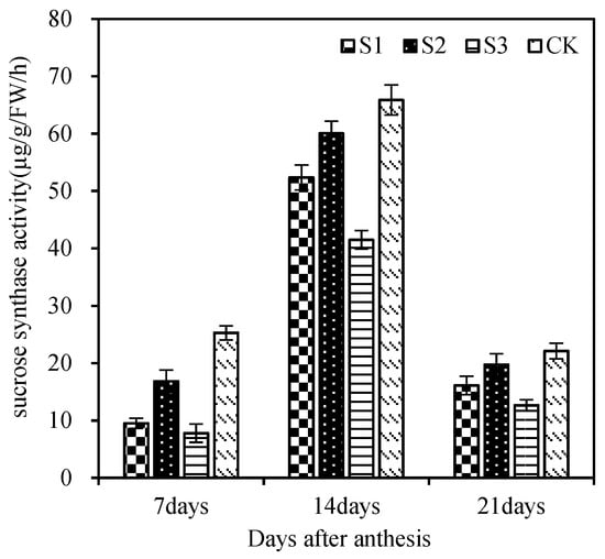 Effects of different leaf cutting methods on sucrose content in grain. S1, cut three leaves; S2, cut the remaining leaves except for the upper three leaves; S3, cut whole leaves; CK, normal plants. Vertical bars represent ± SE of the mean.