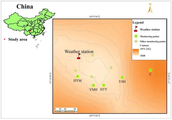 The topographic environment around the monitoring point has an impact on the factors of precipitation and evaporation. In areas where the surface easily collects runoff, soil water content can be maintained at a high level for a long period of time, areas where evaporation is limited can also experience high soil water content for extended periods of time. However, in areas where runoff is not easily collected on the surface and evaporation conditions are unobvious, soil moisture infiltration is relatively reduced and loss is easy, resulting in an increased possibility of relatively low soil water content []. Changes in terrain slope and crop cover are effective measures to affect soil moisture and nutrient changes []. The difference of inclination of karst bedrock is an important factor affecting water infiltration []. Due to the uneven soil thickness in the monitoring area affected by karst landform, when the monitoring point is too close to the bedrock, the water lost along the bedrock surface during precipitation may affect the soil moisture content, making it abnormally higher than the normal value. Because C is located in near the crest of unfavorable to collect runoff, the site has not experienced water infiltration due to water logging for an extended period of time, the average moisture content has long been at around 0.28 m3/m3 (Figure 7), HYM monitoring stations near the bedrock, monitoring results are affected by rapid moisture infiltration and erosion. There is a huge difference in soil water content between the rainy season, dry season, and surface and deep layers (Figure 7).