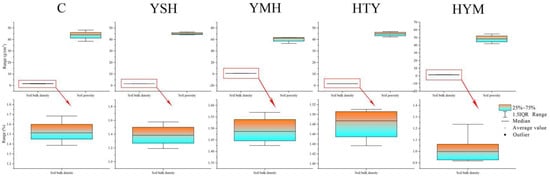 It was found that soil porosity in agroforestry was the largest in HYM, and the smallest in HTY and YMH. Soil bulk density showed little difference, which was lower in HTY and slightly higher in YMH (Figure 3). In general, the distribution of soil porosity and bulk density is more concentrated, with soil bulk density averaging at 1.36 g·cm−3 and soil porosity averaging at 45.44% for other agroforestry soils, except for HYM, which averages at 60.02%. The permeability of C was the lowest, and that of YSH was similar to that of C, HYM was the highest, and YMH was the second. The soil permeability of agroforestry with the highest permeability reached 170 mL·min−1, and the lowest was less than 10 mL·min−1 (Figure 4).