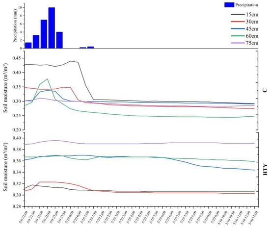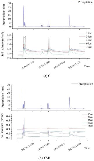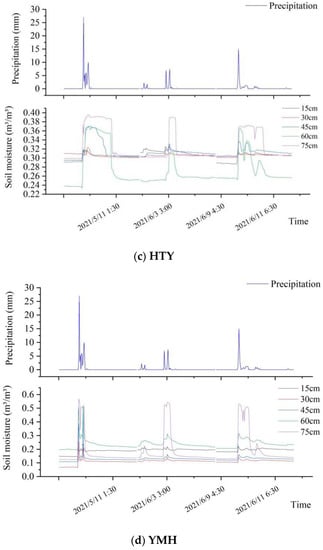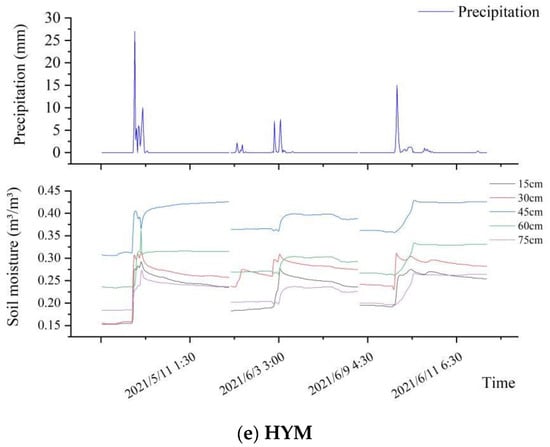 Precipitation does not infiltrate immediately after contacting the surface, and is affected by soil permeability, so the response of soil moisture to precipitation only becomes prominent after a lag period [,]. Firstly, the lag time varies according to the amount of precipitation, the intensity of rain, the duration of rain, the type of agroforestry, the soil texture, and the surrounding catchment conditions (Figure 5; Figure 6), the response of each agroforestry soil started within 30 min on average after rainfall and ended at 2.5 h after the rain on average. Secondly, the response of soil depth was the most obvious in the range of 0–30 cm, and the response degree gradually decreased with the increase of soil depth, the response degree weakened when the soil depth reached 75 cm. Thirdly, under the same precipitation conditions, different types of agroforestry soils had significant differences in the lag of soil to precipitation regulation, with HYM lagging 0.8 h, HTY lagging 0.6 h, YSH lagging 0.3 h and YMH lagging 0.4 h on average. The response of different types of agroforestry soils ended at 2–3 h after rain. Soil moisture content returned to normal (Figure 5).