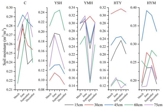 There was an obvious response relationship between soil moisture content and precipitation. Soil moisture content increased significantly in the period of high precipitation, and tended to be stable in the period of no precipitation. In YSH and YMH agroforestry, the process of increasing soil moisture content was short and the time of maintaining high moisture content was also short. In C, HTY and HYM agroforestry, the process of increasing soil moisture content lasted longer. In HYM, the soil depth of 45 cm maintained a relatively high moisture content for a long time (Figure 5).