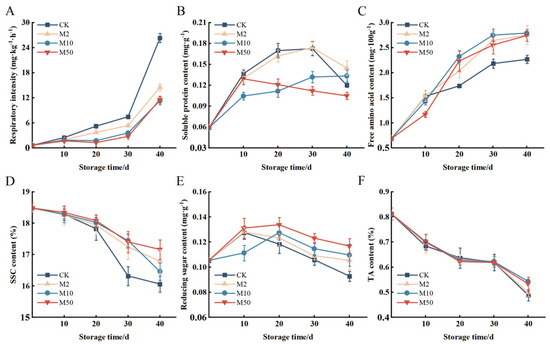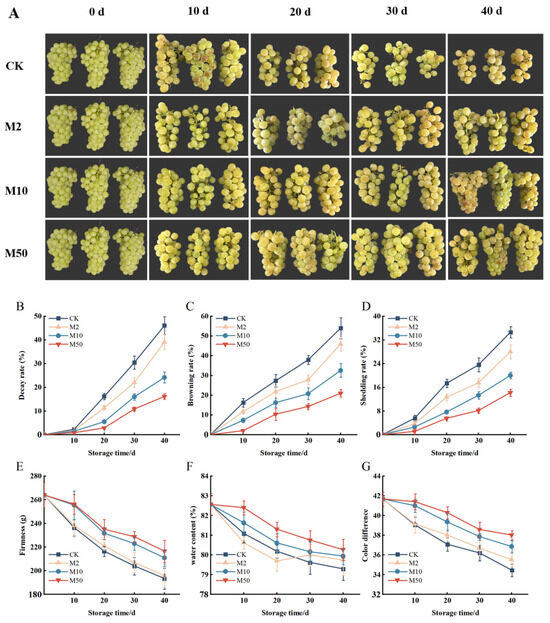 According to Figure 2E, the control group experienced a faster softening rate of “Crystal” grapes during storage. During the 30~40 d storage period, the fruit firmness of the M10 and M50 treatment groups was approximately 1.1 times and 1.0 times that of the control group, respectively. This indicates that the M10 and M50 treatments effectively slowed down the decrease in fruit firmness during storage.
