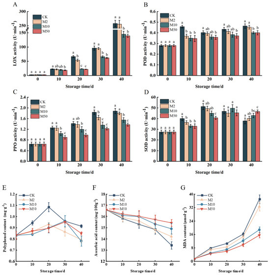 As shown in Figure 4G, the MDA content gradually increased with storage time, indicating a deepening of lipid peroxidation in the fruit membranes. However, the fruits treated with M10 and M50 maintained a low MDA content of 7.077 μmol·g−1 and 5.998 μmol·g−1, respectively. On the other hand, the control group and M2 treatments experienced a sharp increase in MDA content to 37.052 μmol·g−1 and 32.622 μmol·g−1 after 30~40 d of storage. The M10 and M50 treatments effectively inhibited the rise of MDA content during the storage of “Crystal” grapes. This slows down the fruit’s oxidative deterioration, guaranteeing ideal storage quality.