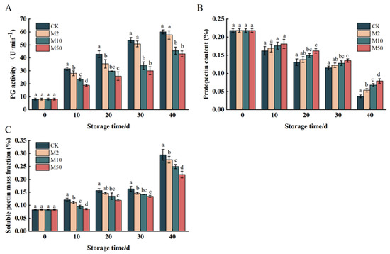 As depicted in Figure 5B,C, this study demonstrates that the application of 1-MCP treatment could inhibit the decrease in propectin mass fraction and the accumulation of soluble pectin to a certain extent. The M50 treatment exhibits the most inhibitory effect on the degradation of protopectin, leading to a significant delay in postharvest softening of “Crystal” grapes. In the later stages of storage, protopectin degradation occurs rapidly, accompanied by a rapid increase in the content of soluble pectin. This may be related to the enhanced activity of PG in the fruit and the accelerated decomposition of protopectin into soluble pectin.