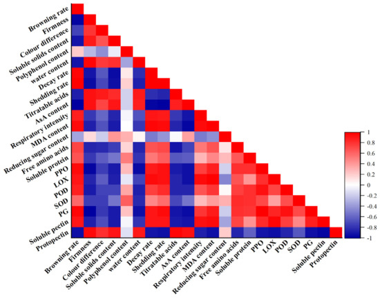 Correlation analysis heat map of 1-MCP fumigation at different concentrations on storage quality of “Crystal” grape related parameters. Red shades indicate varying degrees of positive correlation, and blue shades indicate varying degrees of negative correlation, as shown on the scale bar on the right side of the heat map.
