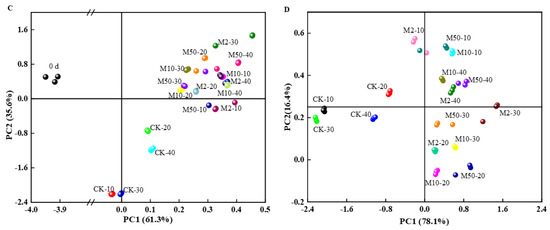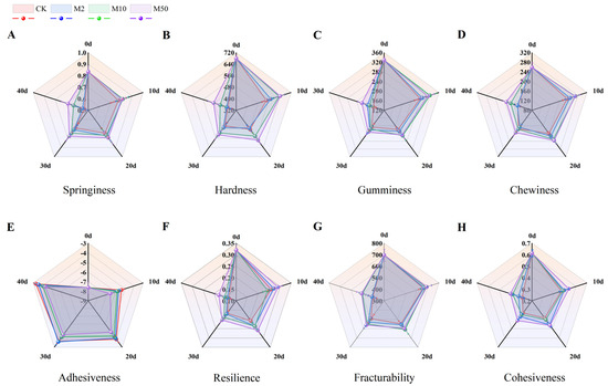 The TPA method was employed to investigate the texture alterations in fruit during postharvest storage. The findings revealed that the M10 and M50 treatments effectively postponed the decrease in fruit hardness, chewiness, springiness, cohesiveness, and adhesiveness of “Crystal” grapes. It has a positive effect on maintaining the postharvest storage texture characteristics of “Crystal” grapes and effectively preserved the original form of the “Crystal” grapes. Notably, the M50 treatment exhibited the most favorable impact (Figure 7A).