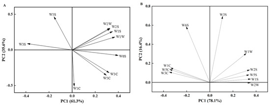 To more comprehensively analyze the differences in aroma substances during the postharvest quality deterioration of “Crystal” grapes, PCA analysis was conducted on the electronic nasal data of “Crystal” grape samples treated with different concentrations of 1-MCP and stored for varying periods. The first principal component accounted for 61.3% of the contribution rate, while the second principal component accounted for 35.6% (Figure 8A). Excluding the volatile constituents of the fruits at the time of harvest, the primary principal component showcased a contribution rate of 78.1% from the 10 sensors, while the secondary principal component exhibited a contribution rate of 16.4% and the cumulative contribution rate of 94.5% (Figure 8B).