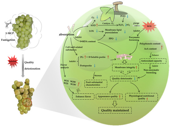 Diagram showing the regulatory effect of fumigation with 1-MCP on “Crystal” grape postharvest quality degradation. Red arrows indicate elevation and blue arrows indicate decline.
