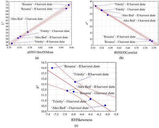 The strongest statistically significant linear relationships between the image features and color parameters were found for parameters L* and a* of the flesh. In the case of parameter L*, Pearson’s correlation coefficients (R) reached 0.999 for the texture aS5SV1InvDfMom extracted from images in the color channel a (Figure 2a). The parameter a* was the strongest correlated (R = −0.999) with the texture RS5SH3Correlat from images in color channel R (Figure 2b). Comparatively, the strongest correlation of the parameter b* (−0.909) was found with the texture RHSkewness. For the parameter L*, the highest correlation with image textures was positive, and for the parameters a* and b* it was negative.
