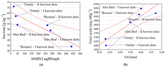 Scatter plots for sucrose (a) and total acids (b) with image textures of the flesh of red-fleshed apples harvested on different dates. I harvest date—31 August 2021, II harvest date—6 September 2021. The first letter in the name of image textures denotes the color channel (b or S); LngREmph—long run emphasis; Teta4—parameter θ4. Blue dot—mean value; red dashed line—confidence interval (95%); solid red line—regression line; and blue dashed line—line connecting the mean value to the sample name.