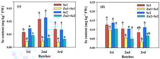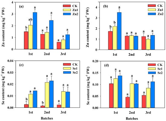 Zn and Se contents in different batches of strawberries treated with Zn and Se alone under substrate (a,c) or soil (b,d) cultivation. Data are presented as mean + SE (n = 3). Different letters above the bars indicate significant differences (p < 0.05) among treatments in the same batch.