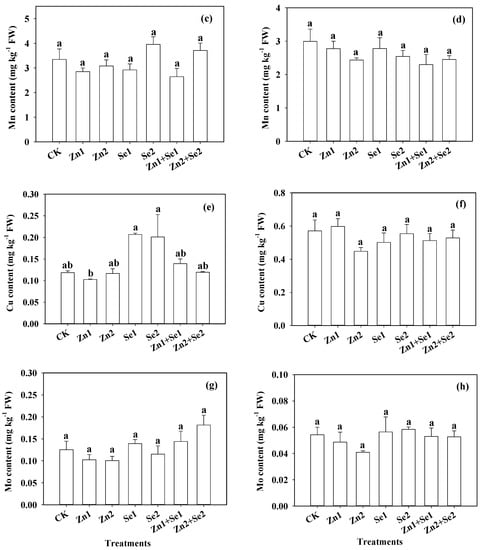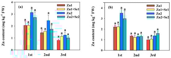 In recent years, several approaches have been developed to enhance Zn and Se levels in crops and animals. According to the World Health Organization (WHO), “fortification” is defined as the intentional addition of nutrients into foods in order to increase the level of one or more nutrients. Biofortification is an economical and effective agricultural process that increases dietary nutrient intake for humans, which has become a key research field []. Several studies have been performed aiming at biofortifying crops with Zn and Se [,]. Numerous methods have been reported for Zn and Se application, such as seed dressing, seed soaking, and soil and foliar application. Among these, foliar application has been widely used because of its practicability and effectiveness in Zn and Se biofortification. Inorganic selenium is commonly used as an exogenous selenium fertilizer, among which Na2SeO3 has been widely used in production because of its high concentration of active ingredients and high-water solubility []. Absorbed selenite is more easily incorporated into the Se form available to the human body than selenate []. For soil application, more than 80% of Se was found to be fixed in soil after Se was added for 2 months, which considerably reduced Se bioavailability []. Wang et al. [] found that both soil and foliar Se applications effectively improved Se content in maize grains (Zea mays L.), but foliar Se application is more cost-efficient and effective. Zhu et al. [] reported that spraying Se fertilizer could increase Se content and lower heavy metals in grapes (Vitis vinifera L.). Zahedi et al. [] also observed that foliar spraying Se nanoparticles improved the growth and yield of strawberry plants. Earlier studies also showed that foliar Zn application significantly increased Zn content in maize and rice grains (Oryza sativa L.) [,].