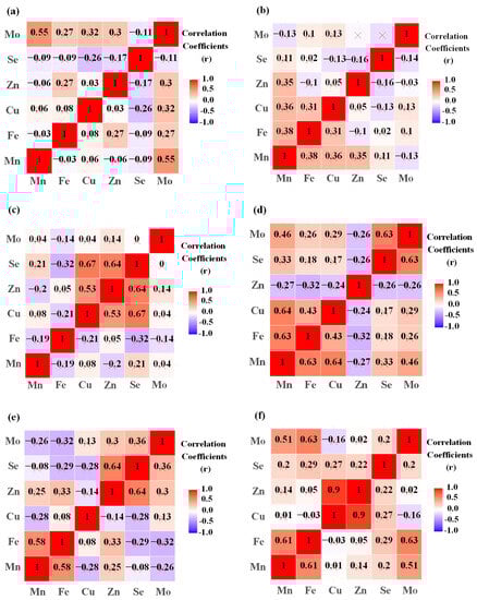 Correlation analysis of Zn, Se, and mineral contents in the first, second, and third batches of strawberries under substrate (a,c,e) or soil (b,d,f) cultivation. The red cross indicates the correlation is not significant (p > 0.05), n = 21.