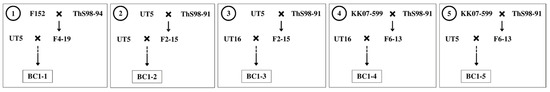 Two commercial cane genotypes UT5 and UT16 were assigned as donor parents because they possessed high sugar content and yield (Table 1). Five populations of interspecific hybrid backcross 1 (BC1) used in this study were labelled as BC1-1, BC1-2, BC1-3, BC1-4, and BC1-5 (Figure 1). While three populations, BC1-1, BC1-2, and BC1-5, had genotype UT5 as a donor female parent, the other two populations, BC1-3 and BC1-4, had genotype UT16 as the donor female. The F1 hybrids were previously developed by the Department of Agriculture (DOA) Thailand utilizing two S. spontaneum genotypes ThS98-91 and ThS98-94 as founder male parents. Those wild types showed high fiber, tiller number, and stalks per clump, but they had low sweetness and tiny stalk diameter.