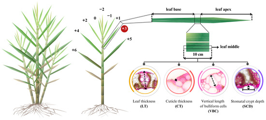 Leaf sampling and measurement position in each tiller of each sugarcane genotype.