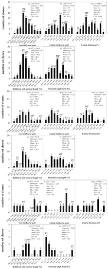 Frequency distribution of leaf anatomy in three populations of interspecific backcross 1: BC1-1 (UT5 × F4-19) (N = 73) (a–e); BC1-3 (UT16 × F2-15) (N = 35) (f–j); and BC1-2 (UT5 × F2-15) (N = 8) (k–o). MP, P1, and P2 are mid-parent, female parent, and male parent, respectively. Numbers above the bars are the number of clones in each class interval. SD is standard deviation. CV% is coefficient of variation on given traits, calculated as (SD/mean) × 100.