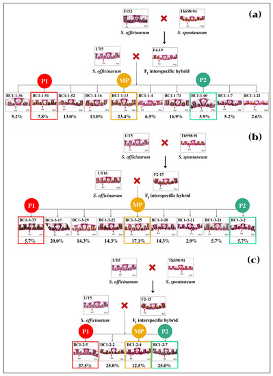 In population BC1-1, the percent SCD of male and female parents were different, where the male had high SCD but the female showed an unclear SCD. We found that six clones BC1-1-7, BC1-1-21, BC1-1-62, BC1-1-74, BC1-1-81, and BC1-1-88 (5.6–6.6%) had a higher percent SCD than the male parent, whereas 31 clones and the remaining clones had a similar percent SCD to the male and female parents, respectively (Figure 4a). In population BC1-3, the SCD of both parents was also obviously different, where the male had a higher SCD than the female. All BC1-3 clones had SCD variations. While clone BC1-3-2 had a similar SCD to the male parent, the remaining clones were like the female parent (Figure 4b). Likewise, in populations BC1-4 and BC1-5, the male had higher SCD than the female, but the distributions of progenies between those two BC1 populations were slightly different (Figure S2). In population BC1-2, both parents had distinct SCD, where the male had high SCD, but the female had low SCD. Clone BC1-2-7 had similar SCD to the male parent, whereas three clones were like the female parent (Figure 4c). The remaining clones had values between the female and the mid-parent.