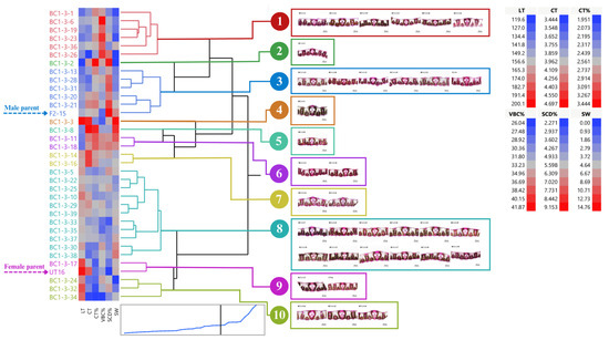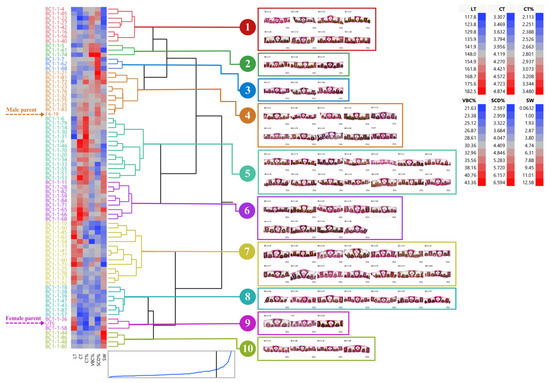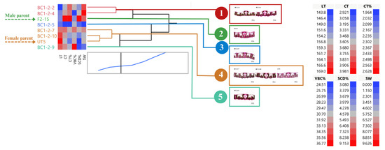 BC1-2 and their parents can be clustered into five groups (average R2 = 0.90) (Figure 7). Groups 1 and 2 had low LT, whereas high LT was found in group 4 (three clones: BC1-2-7, BC1-2-10, and the female parent) and group 5 (BC1-2-9). A low percent VBC was found in groups 1, 2, and 3. Groups 1 and 2 showed high percent SCD and stalk weight. We only noticed one clone, BC1-2-4, that can appeal to the selection criteria (Figure 7).