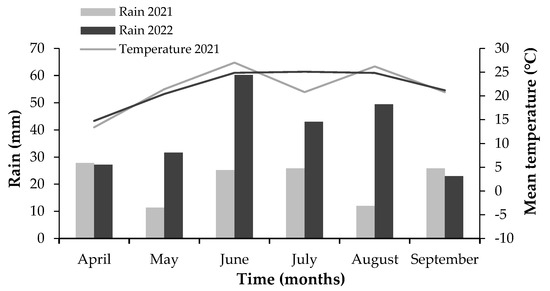 Climatic conditions (mean monthly air temperature and total monthly rainfall) during the two growing seasons of 2021 and 2022.