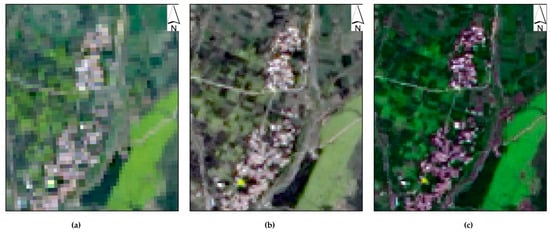 Comparison of local images before image processing: (a) Landsat 8 true-color composite display with 30 m resolution; (b) true-color display after data fusion with 15 m resolution; and (c) true-color display after vegetation enhancement based on (b).