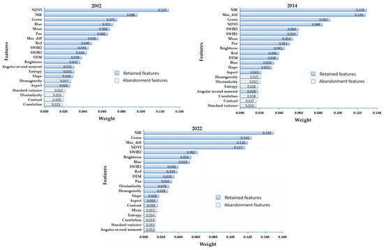 Based on the multi-scale segmented objects, nine spectral features, NDVI, three terrain features, and eight texture features were extracted to participate in the classification. The 21 features extracted in 2002, 2014, and 2022 were input into the RF_RFE algorithm for feature optimization, and the final number of retained features was 17, 15, and 16, respectively. All spectral features, NDVI, and terrain features were retained, and some texture features were filtered out. According to the importance analysis (Figure 3), it can be seen that the NDVI, NIR band, green band, and Max_diff contributed more to the crop identification process, while the contributions of texture features were relatively small.