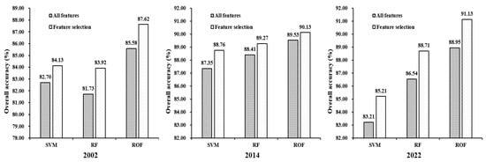 The data before and after the feature selection were input into different classifiers and run 10 times to obtain the average accuracy, as shown in Figure 4. The crop identification accuracy after the feature selection in 2002, 2014, and 2022 improved by 1.43–2.19%, 0.60–1.41%, and 1.99–2.18%. All three machine learning classification algorithms based on feature selection achieved a good classification performance with a validation accuracy above 83.92%. Among them, the ROF algorithm achieved the best classification performance with validation accuracies of 87.62%, 90.13%, and 91.13% for 2002, 2014, and 2022 crop classification, respectively. The ROF algorithm was subsequently selected to complete the crop classification mapping of the Huangshui basin.