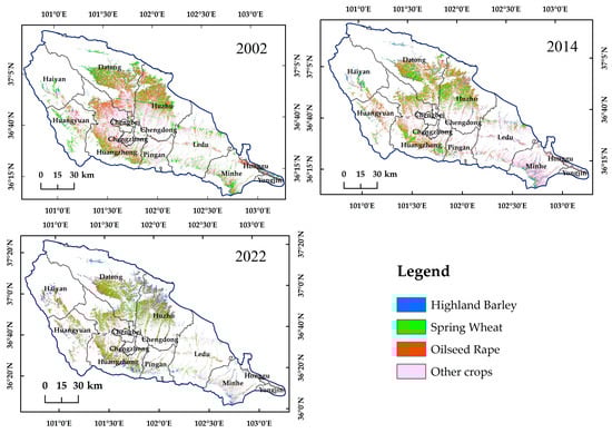 The spatial distribution of oilseed rape was the most widespread among the major crops grown in the Huangshui basin, followed by spring wheat, and then highland barley. The planting area of crops in the study area changed significantly from 2002 to 2022, and there was a noticeable shift in crop distribution.