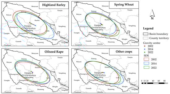Gravity center and standard deviation ellipse of major crops in the Huangshui basin, including four categories of crops: highland barley, spring wheat, oilseed rape, and other crops in 2002, 2014, and 2022.