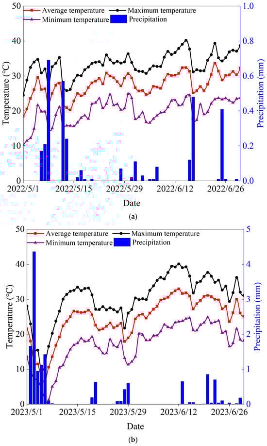 Temperature and rainfall during the whole growth period of pakchoi. (a) Temperature and rainfall in 2022. (b) Temperature and rainfall in 2023.