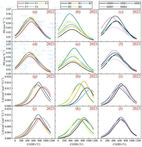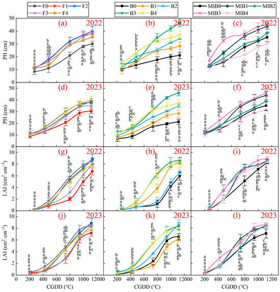 Plant height and leaf area index compared with cumulative growing degree days in 2022 and 2023. Different letters indicate significant differences among treatments at p < 0.05.