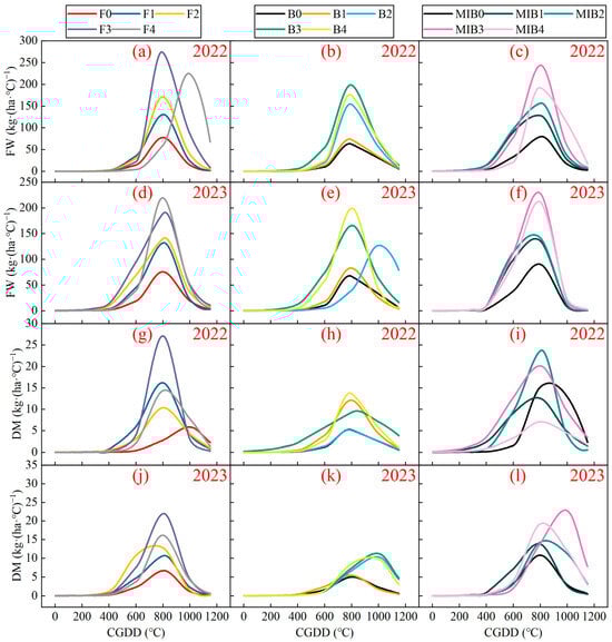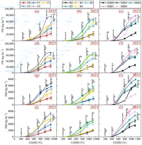 Fresh weight and dry matter accumulation compared with cumulative growing degree days in 2022 and 2023. Different letters indicate significant differences among treatments at p < 0.05.