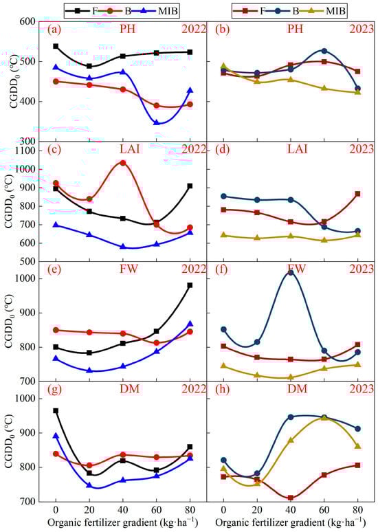 Figure 6a–h illustrates the trend of CGDD0 with an increasing organic fertilizer gradient. The minimum CGDD0 values for PH, LAI, FW, and DM were observed in the MIB3, MIB2, MIB2, and F2 treatments, respectively. In conclusion, the appropriate application of organic fertilizer can significantly increase the maximum growth rate of the pakchoi growth indices, reflecting the positive impact of organic fertilizer on pakchoi growth. However, it is crucial to avoid excessive application, as it may have adverse effects on pakchoi growth. Moreover, the choice of irrigation water type, especially MIB water, can further enhance the efficiency of organic fertilizer use and promote the fast growth period of pakchoi, as indicated by the shifting of the inflection point of the logistic curve.