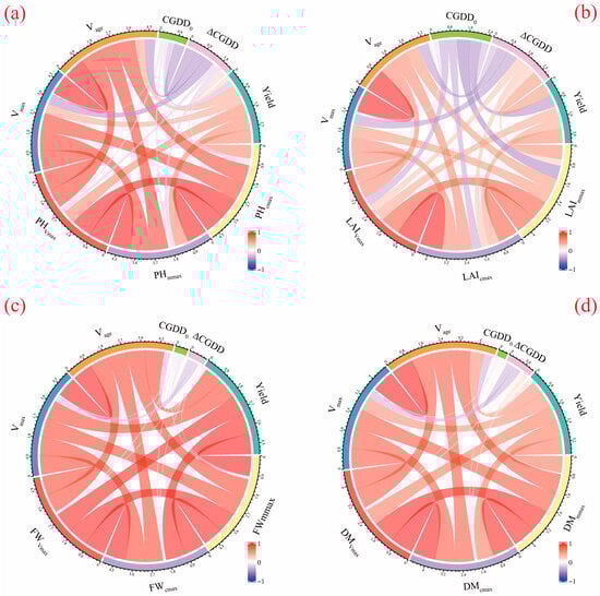 Ymmax, Ycmax, YVmax corresponding to the PH (Figure 7a), FW (Figure 7c), and DM (Figure 7d) of pakchoi have a very strong positive correlation, with a correlation coefficient greater than 0.99. Vmax and Vavg also have a strong positive correlation with Ymmax, Ycmax, and YVmax, with a correlation coefficient of 0.88–0.94. In contrast, the correlation coefficient between Ymmax, Ycmax, and YVmax of LAI is 0.86, and the correlation coefficient between Vmax, Vavg and Ymmax, Ycmax, and YVmax is 0.58–0.66 (Figure 7b). The correlations between CGDD0, ΔCGDD, and other parameters are low or even negative. Yield is positively correlated with the Ymmax, Ycmax, YVmax, Vmax, and Vavg of PH, FW, and DM and negatively correlated with CGDD0 while being positively correlated with ΔCGDD. Therefore, the growth index of pakchoi directly affects yield formation, and extending the duration of the fast growth period appropriately can increase yield.
