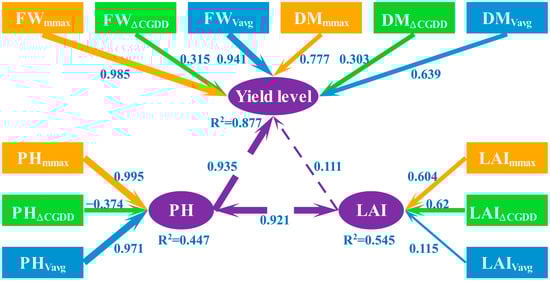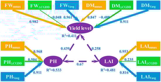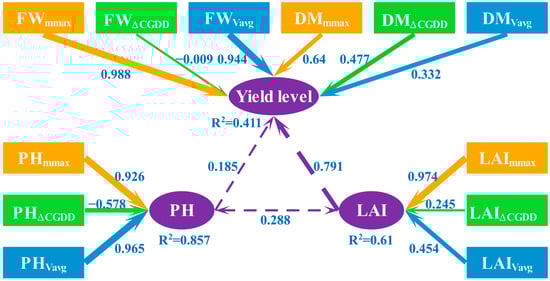 The direct effects of PH and LAI on the yield level of pakchoi were positive, but their impact was limited. The effect of PH on yield level was greater than that of LAI under fresh water and brackish water irrigation, while the effect of LAI was greater than PH under magnetized–ionized brackish water irrigation. PHmmax and LAImmax had the strongest direct effect on PH and LAI under fresh water irrigation, while PHΔCGDD and LAIΔCGDD had the smallest effect. Fmmax had the largest direct effect on the yield level, while DMmmax had the smallest effect, and FWΔCGDD and DMΔCGDD had negative effects (Figure 8). Under brackish water irrigation, PHmmax and LAIΔCGDD had the greatest direct effect on PH and LAI, while PHVavg and LAIVavg had the smallest effect, and PHΔCGDD had a negative direct effect on PH. Fmmax had the largest direct effect on the yield level, while DMΔCGDD had the smallest effect (Figure 9). Under magnetized–ionized brackish water irrigation, PHVavg and LAImmax had the strongest direct effect on PH and LAI, while PHmmax and LAIΔCGDD had the smallest effect, and PHΔCGDD had a negative direct effect on PH. Fmmax had the largest direct effect on the yield level, while DMVavg had the smallest effect, and FWΔCGDD had a negative effect (Figure 10).