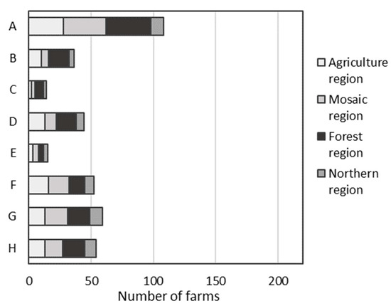 Data were acquired from a previous survey of farmer attitudes by the Swedish company Mind Research (unpublished, 2017) [47]. The survey was commissioned by the Swedish Board of Agriculture, aiming to better understand how farmers used grazing and their attitudes towards agri-environmental payment for grazing, as presented by Karlsson [47]. The focus of the survey was the payment scheme for management of pastures and meadows under CAP pillar II, and the replies related to farmers’ attitudes regarding their five-year commitments within the programme period for agri-environmental schemes in Sweden at the time (2014–2020). The survey was performed during August–September 2017 as a postal questionnaire with telephone reminders, with a total of 23 questions related to the size and number of animals at the farm, which areas of the farm were used for grazing and hay harvesting, which agri-environmental payments had been granted, and the farmer’s response and attitudes in relation to the rules for payment (Swedish Board of Agriculture and Mind Research, unpublished, 2017). The questionnaire was sent to 2600 Swedish farmers and was answered by 1117 farmers (43% response rate), out of a total population of 30,000 farms in Sweden. The results were weighted to represent the total population of farms with respect to two herd size categories for cattle (1–100 or >100) and sheep (1–50 or >50), respectively, and four geographical regions. The four regions corresponded to an administrative division of Sweden based on the dominant structure of the landscape and other factors influencing the potential for farm production (“jordbrukets produktionsområden”) [48].