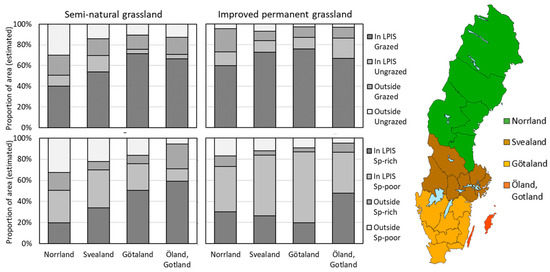 Proportion of the estimated area of grazed and ungrazed grassland within and outside the Swedish Land Parcel Information System (LPIS) [111,112] according to grassland monitoring from aerial photographs and field data [49,50]. Sp-rich is defined as having five indicator plant species or more. Note that this regional classification differs from the one used in the interview survey (Figure 1, Figure 2, Figure 3, Figure 4 and Figure 5).