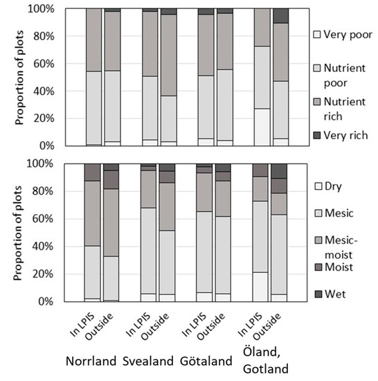 Soil conditions are of fundamental importance to understanding and predicting both the production and biodiversity values of grasslands. In effect, both the biodiversity of plants in grassland vegetation [6,65] and the productivity in terms of biomass per hectare available for grazing are influenced by soil type and moisture in very much the same way [14,33,66]. However, empirical data on biomass production in relation to site characteristics and the effects of management by grazing on vegetation quality in Swedish semi-natural grasslands are scarce and partly unreliable [66]. In an attempt to predict the availability and possible lack of grazing animals in various parts of Sweden, Blom [33] used climate-related regional data for a quantitative model linking biomass production to vegetation type, length of the growing season, and the estimated availability of grazing animals. The study of Blom indicated that the availability of grazing cattle, sheep, and horses was a limiting factor for sufficient management of the available grasslands in about 40% of the 276 municipalities in Sweden [33].