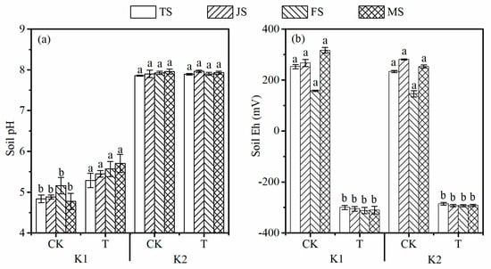 Soil pH (a) and Eh (b). Different letters indicate the significant differences among treatments at p < 0.05. Values are the means ± standard deviation (n = 3). CK, dry-wet alternation; T, flooding; TS, tillering stage; JS, jointing stage; FS, grain filling stage; MS, maturation stage.