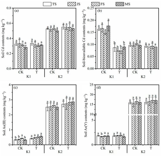 Effects of water managements on soil Cd (a); bioavailable Cd (b); As(III) (c); and As(V) (d) contents under different soil conditions. Different letters indicate significant differences among the treatments at p < 0.05. CK, dry–wet alternation; T, flooding; TS, tillering stage; JS, jointing stage; FS, grain filling stage; MS, maturation stage.