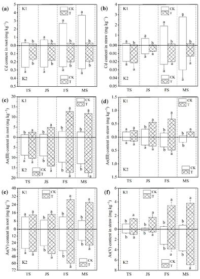 Effects of water management on Cd content in root (a) and straw (b); As(III) content in root (c) and straw (d); As(V) content in root (e) and straw (f) under different soil conditions. Values are the means ± standard deviation (n = 3). Different letters indicate significant differences among the treatments at p < 0.05. CK, dry–wet alternation; T, flooding; TS, tillering stage; JS, jointing stage; FS, grain filling stage; MS, maturation stage.