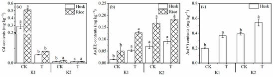Effects of water managements on Cd (a), As(III) (b), and As(V) contents in husk and brown rice (c) under different soil conditions. Different letters indicate the significant differences among treatments at p < 0.05. CK, dry–wet alternation; T, flooding.