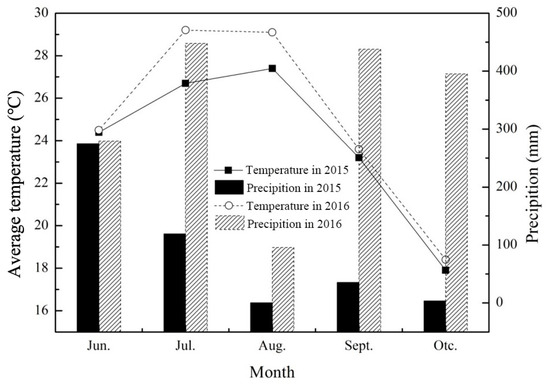 This 2-year field experiment was conducted at Danyang Experimental Station (32°00′ N, 119°32′ E), Jiangsu Province, China. At this site, rice (Oryza sativa L.) is grown in a rotation with winter wheat, and the cultivation system has been a rice–wheat rotation system for more than five years. This experimental area is characterized by a subtropical monsoon climate with a mean annual air temperature of 16.4 °C and a mean annual rainfall level of 882 mm. The meteorological data were obtained from a meteorological station (Watch Dog 2900ET, SPECTRUM, USA) positioned 100 m from the experimental station. The monthly average temperature and precipitation were recorded from rice transplantation to harvest over the 2015 and 2016 rice growing seasons (Figure 1). The average temperatures were 23.9 (17.9–27.4 °C) and 25.0 °C (18.4–29.2 °C) during the 2015 and 2016 rice growing seasons, respectively. The amounts of precipitation during the rice growing seasons were 433.8 and 1652.4 mm in 2015 and in 2016, respectively. The soil at the experimental site was classified as an Orthic Acrisol (FAO soil taxonomy). Before transplanting and fertilization, 0–20 cm of soil was taken for determination of soil basal fertility, following Bao’s method [25]. The soil basal fertility characteristics were as follows: a pH of 6.33 ± 0.04, an organic matter content of 19.56 ± 0.28 g kg−1, a total N content of 1.25 g ± 0.02 kg−1, a mineral N (NH4+-N + NO3−-N) content of 19.36 ± 0.31 mg kg−1, an Olsen-P content of 27.92 ± 0.19 mg kg−1, and an NH4OAc-extractable K content of 168.00 ± 3.12 mg kg−1.