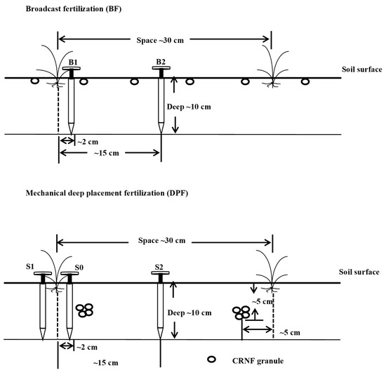 Mechanical deep placement fertilization (DPF) is an effective application method to minimize N losses and to improve rice production. DPF provides immediate plant nutrient uptake and prolongs N availability, since the N fertilizer is applied close to the plant roots. Recently, a meta-analysis showed that DPF significantly increased rice yield and NUE by 32% and 34% [20], respectively, but conventional N fertilizer may not be suitable for mechanical single-time deep application due to its light weight which limits uniform application and rapid N release [21]. CRNF with a balanced slow-release N pattern might be a promising alternative to conventional N fertilizer for DPF. DPF has often been applied combined with CRNF for higher NUE and rice yield [22,23], and DPF with CRNF have been shown to not reduce rice growth and NUE compared to split application [23]. With the development of agricultural machinery and new CRNF types (e.g., BBF), improving rice yield and farmer income by optimizing CRNF in combination with DPF management continues to be a major concern. However, it is still unclear which CRNF-DPF combination is better for rice production and economic benefits.