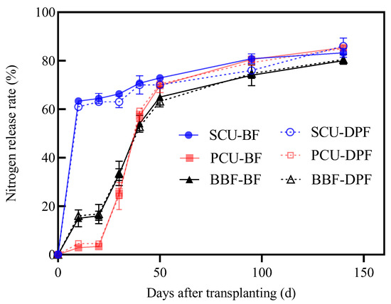 Nitrogen release from SCU, PCU, and BBF under broadcast fertilization (BF) and deep placement fertilization (DPF) conditions. Error bars indicate standard errors of replicates.
