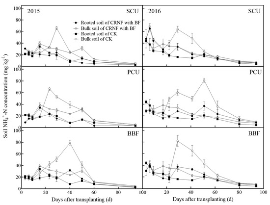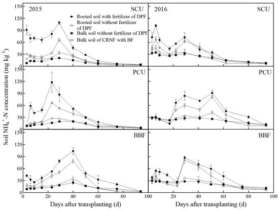 Dynamics of NH4+-N concentrations in the rooted soil with fertilizer (S0), rooted soil without fertilizer (S1), and bulk soil without fertilizer (S2) for SCU, PCU, and BBF with deep placement fertilization treatment (DPF), in 2015 and in 2016. The NH4+-N concentrations of corresponding bulk soil of CRNF with broadcast application (BF) were added to each figure as controls. The data for 2015 are on the left side, and the data for 2016 are on the right side. Error bars indicate standard errors of replicates.