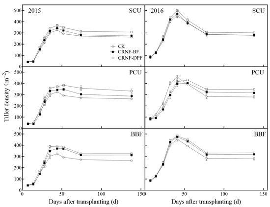 Dynamics of rice tillers for SCU, PCU, and BBF between broadcast fertilization (BF) and deep placement fertilization (DPF) conditions in 2015 and in 2016. High-yield split fertilization of urea (CK) was added for each figure as controls. The 2015 data are on the left side, and the 2016 data are on the right side. Error bars indicate standard errors of replicates.
