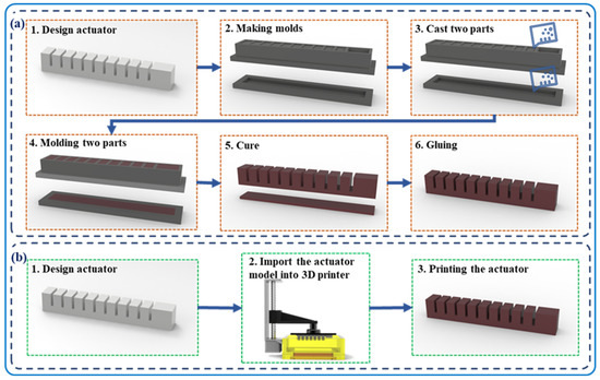 Main procedure of fabricating a pneu-actuator via (a) molding approach and (b) 3D printing method.